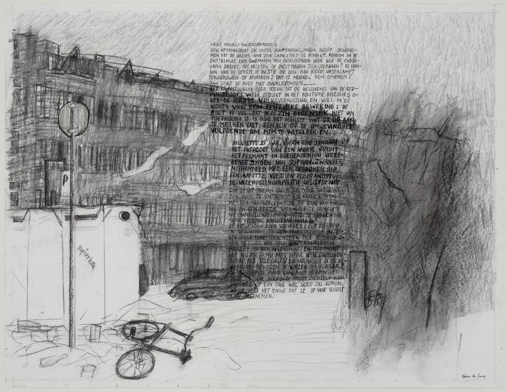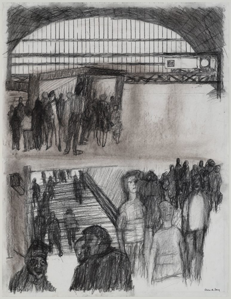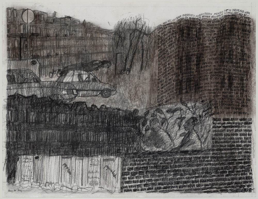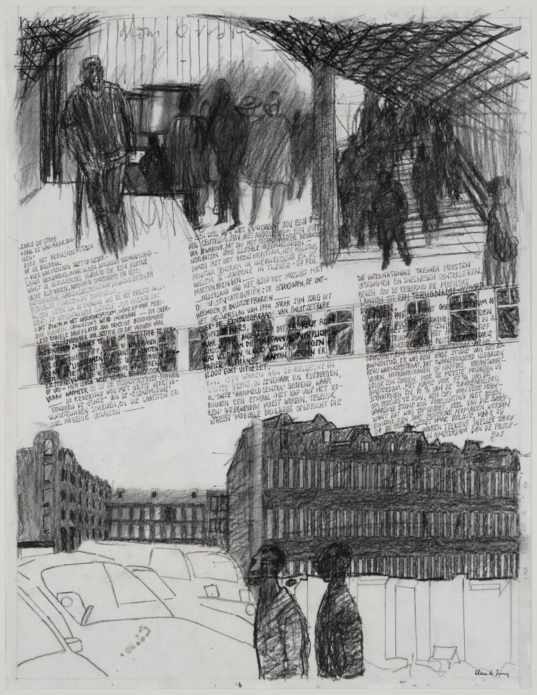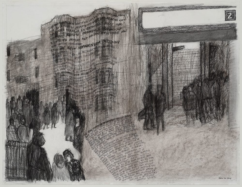 Clara de Jong 1966, in bezit van de Beeldbank van het Gemeentearchief Amsterdam.”Het mondiaal gegeven, namelijk de al sinds langere tijd op gang gekomen mensenstroom, op de vlucht voor oorlog en armoede op zoek naar veiligheid en perspectief laat Amsterdam niet onberoerd, oftewel de stad wordt met het probleem geconfronteerd,” schrijft Clara in haar aanbiedingsbrief (aan de commissie van de Topografische Atlas). Ze verwijst naar een aantal artikelen en rapporten waaraan zij brokken tekst heeft ontleend. Plaats van handeling is o.a. de Kinkerbuurt, waar zij de veranderende bevolkingssamenstelling kan waarnemen en het Centraal station “….plaats van aankomst en vertrek, waar eenzame zielen ronddolen, en nog zoveel anderen.” (P.B)